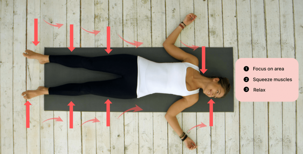In this exercise, you are tensing groups of muscles as tightly as you can and then releasing the pressure to help each part of your body relax. Over time you will become more aware of the early signs of tension in your body and can focus this exercise on your problem areas.