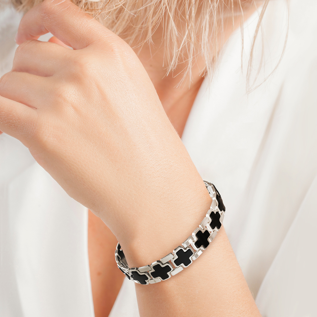 Cuelly Cross Link Bracelet is an elegant way to take care of yourself. Chosen by many of our young friends, this design fits well with your day-to-day casuals. Made of plated silver for ultimate durability and anti-tarnish, and high-quality plastic for lighter weight and comfort, this piece will stay your faithful friend for many years to come.